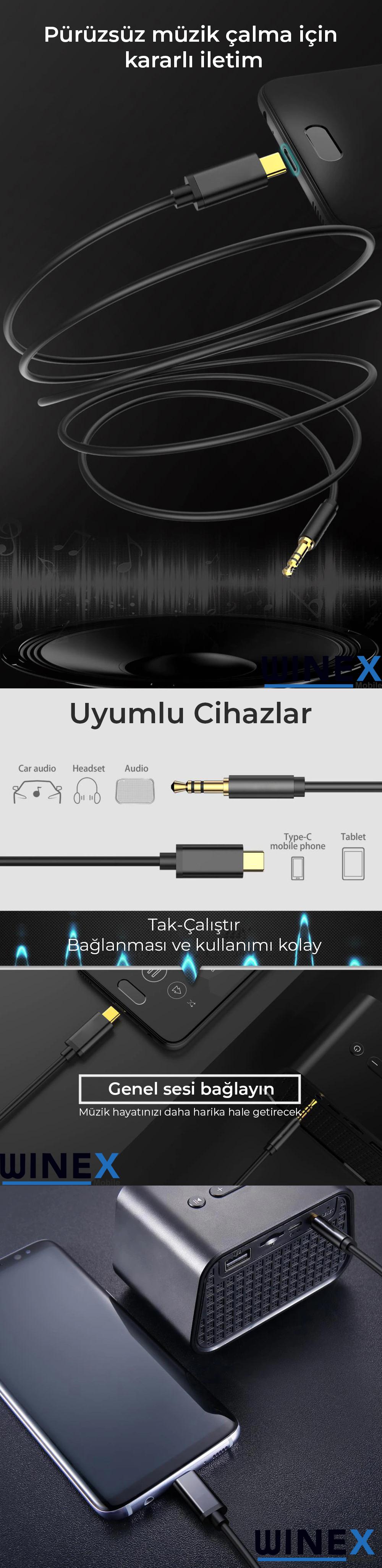 Winex AX36 Type-C to 3.5mm Aux Ses Kablosu Siyah Winex Type-C to 3,5 mm Ses Kablosu, iPhone veya iPad’inizi araç veya ev içi stereo sistemlerinizdeki 3,5 mm jaka bağlayarak dilediğiniz yerde müzik dinlemenize olanak verir. Type-C KonnektörüType-C konnektörünü cihazlarınıza, 3,5 mm aux jakını arabanızın stereo ses sistemine veya evdeki hoparlör sisteminize bağlayın, tek bir kabloyla kolayca bağlantı kurun. Dijital - analog arası bağlantıNet sesli görüşmeler ve kusursuz bir müzik dinleme deneyimi için 3,5 mm bağlantı noktası kullanan tüm ses jakları üzerinden 48 kHz’ye kadar 24 bit ses çıkışını destekler. Bu elektronik aksesuar özellikle Type-C ile bağlantı kurmaya yönelik tasarlanmıştır ve Type-C port çıkışlı cihazlarınızda performans standartlarına uyumludur.Type-C port çıkkışlı cihazlarınızda, arabanızdaki veya evinizdeki stereo ses sistemlerinin jakına kolayca bağlayabilirsiniz Type-C Konnektörü Dijital - analog arası bağlantı Type-C port çıkışlı tablet, telefon ve tüm multimedya cihazlarınızda güvenle kullanabilirsiniz. |