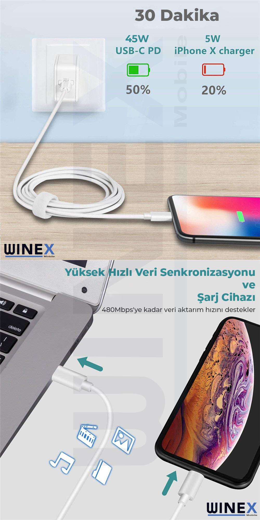 Winex Mobile İphone XR 3A 45W Type-C to Lightning 3Metre Data ve Hızlı Şarj Kablosu