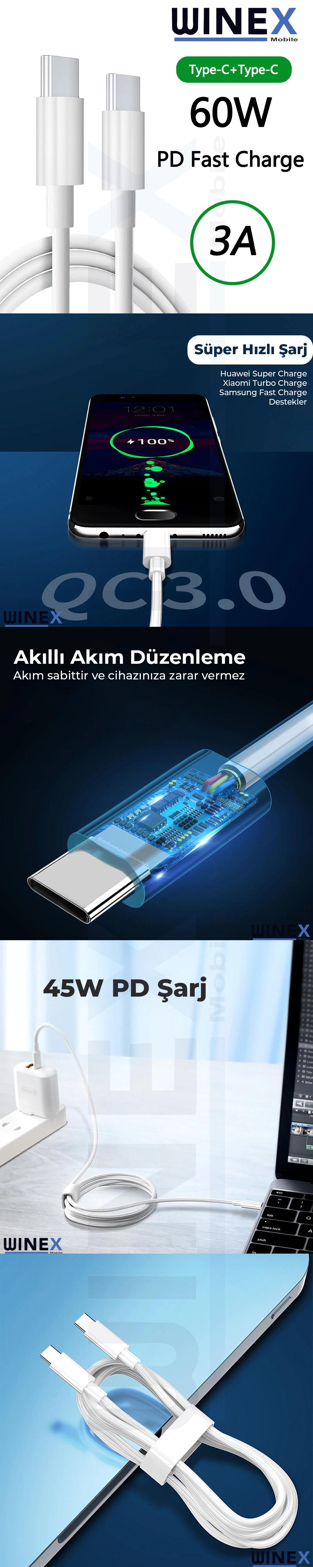 Winex SX262M 3A 45W Type-C to Type-C 2Metre Data ve Hızlı Şarj Kablosu Beyaz