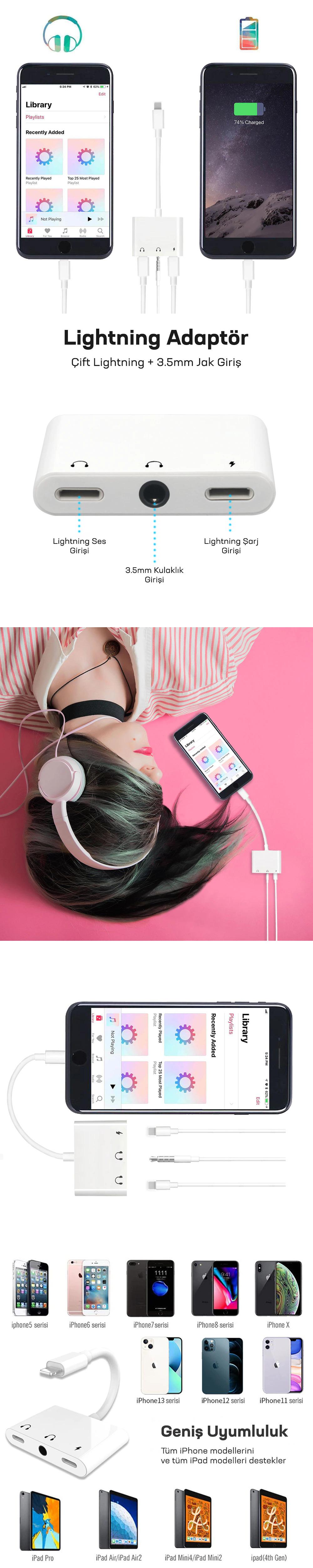 Özelliği: Şarj aleti kablosu Adaptörü Bağlantı + Şarj + Ses Aux+ Ses Ligtning Port Adaptörü