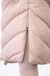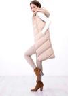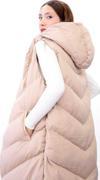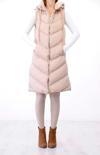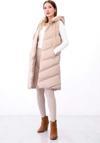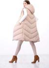 Uzun kesimi ile hem şıklığı hem de sıcaklığı bir arada sunan bej kadın kapüşonlu uzun yelek, günlük kullanımda rahatlık sağlar.