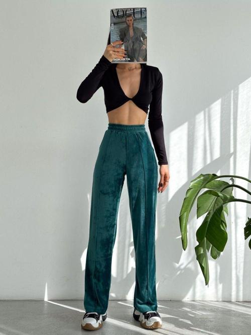 - Kadife materyali lüks bir dokunuş katarken geniş paça tipi modern trendleri yansıtır.