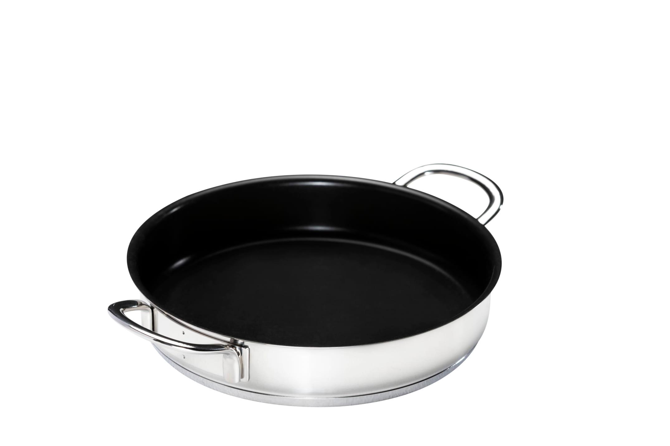 Cromargan:registered:: 18/10 paslanmaz çelik. İçi yapışmaz kaplama, kolay temizlenebilir, fırında kullanıma uygundur, tadı yoktur ve aside dayanıklıdır.