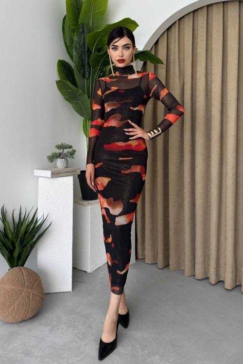 ÜRÜN KUMAŞ MATERYAL BİLGİSİ VE ÜRÜNLE İLGİLİ TÜM DETAYLI BİLGİLER ÜRÜN ÖZELLİKLERİ KISMINDA SEÇENEKLERDE BİLGİNİZE SUNULMUŞTUR - Batik desenleriyle süslenmiş, tasarım dik yaka midi elbise, her yaş grubuna hitap eden şık ve modern bir görünüm sunar.
