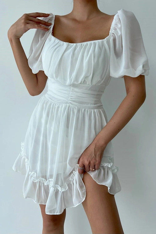Woman Vısıon Kadın Tasarım Astarlı Şifon Kumaş Kare Yaka Kloş Kesim Kısa Kollu Beyaz Mini Elbise 069