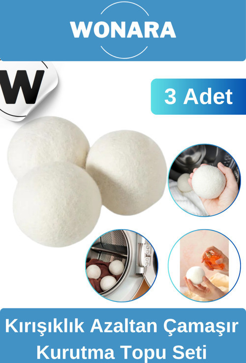 Wonara Doğal Yünlü Kırışıklık Azaltan Hızlı Kuruyan Sürtünme Önleyici 3’lü Çamaşır Kurutma Topu Seti