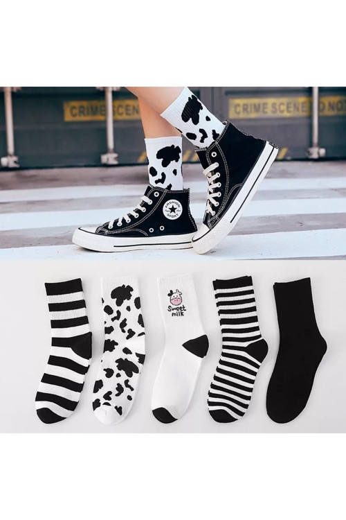 5'li Kadın Siyah-beyaz Inek Desenli Çizgili Pamuklu Tenis Kolej Çorap