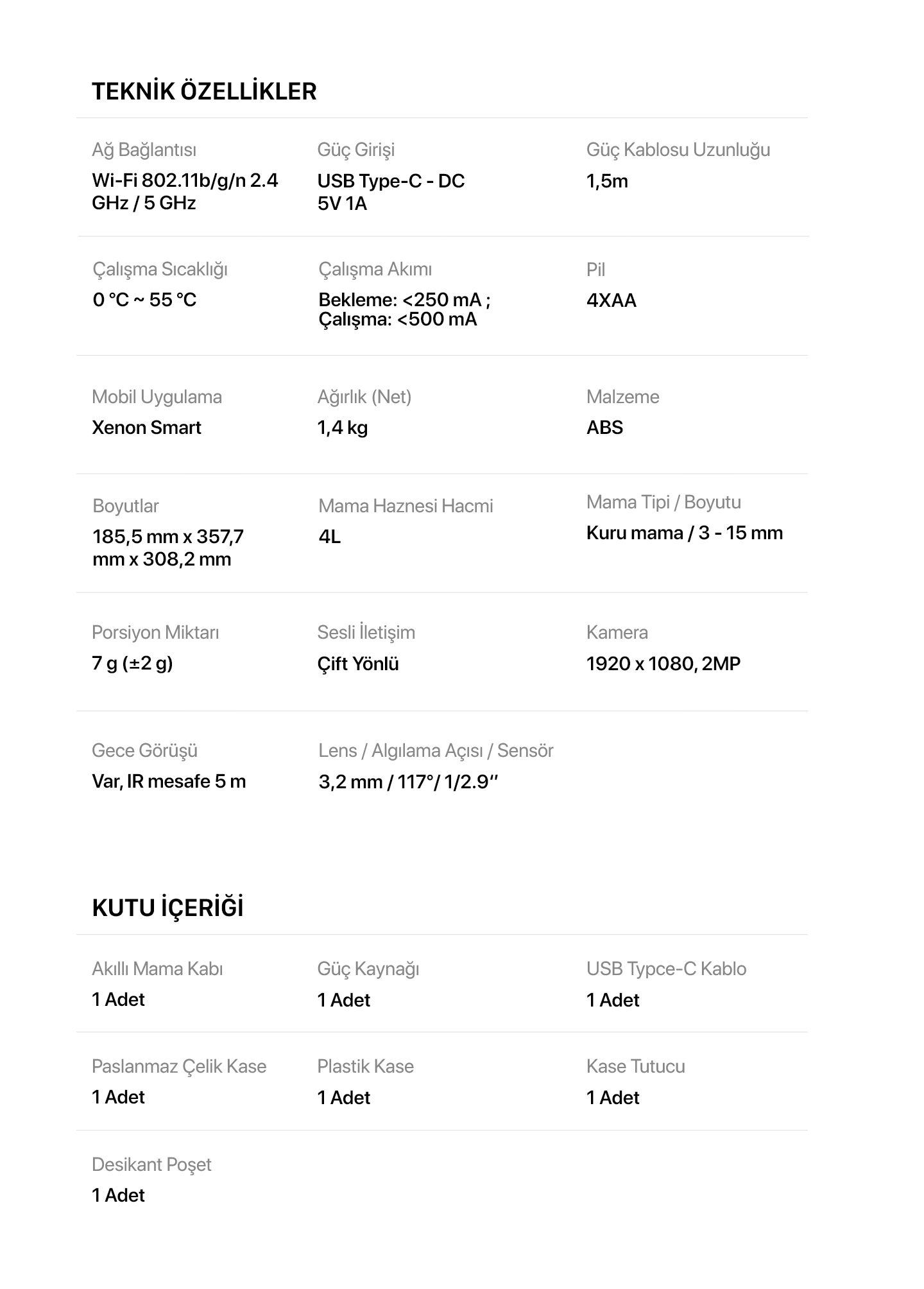 Xenon Smart Akıllı Mama Kabının 1920 x 1080 çözünürlükteki 2 MP kamerası gece görüş özelliğine sahiptir. Böylece evcil hayvanınızın beslenmesini, güvenliğini ve ne yaptığını günün hangi saatinde olursanız olun çok net bir şekilde izleyebilirsiniz.
