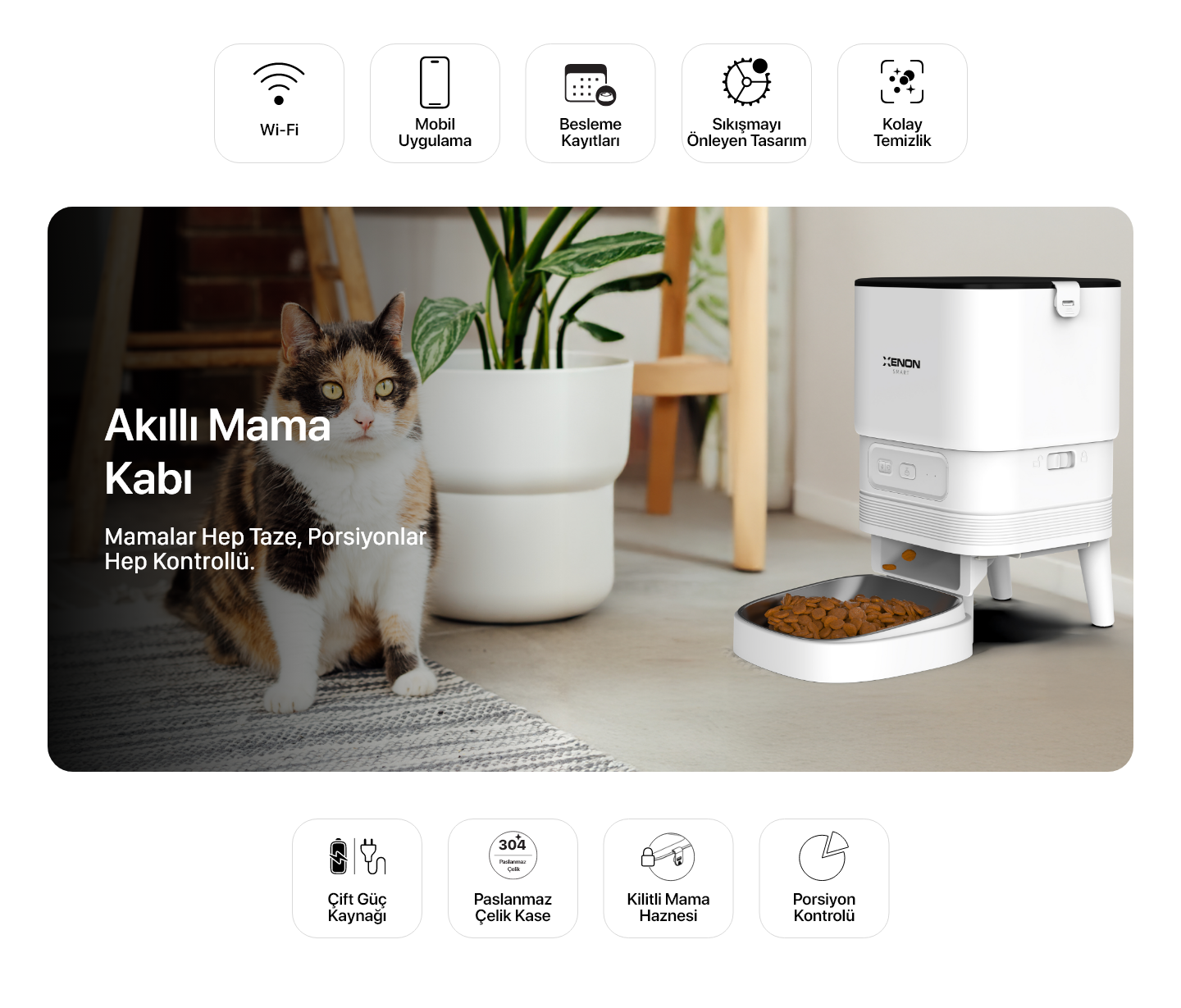 Akıllı Mama Kabı, evcil hayvanınızın beslenmesini istediğiniz zaman ve istediğiniz porsiyonda sunacak şekilde otomatik olarak düzenlemenizi ve evde değilken de mobil uygulama üzerinden kolayca yönetmenizi sağlar.