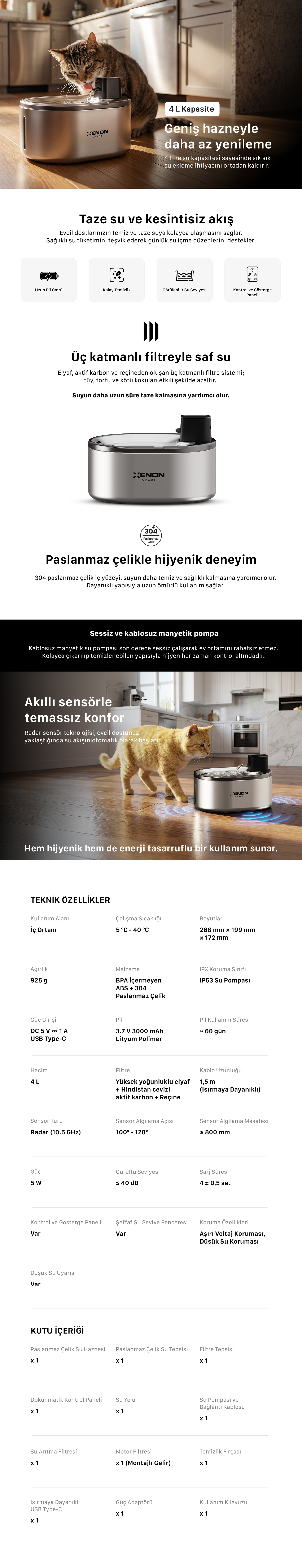 Xenon Smart Su Pınarı | Akıllı, 4L, Radar Sensörlü, 3 Katmanlı Filtre, 60 Gün Şarjlı, Çelik İç Yüzey (X8657) Xenon Smart X8657 Otomatik Su Pınarı, evcil dostlarınızın gün boyu taze ve temiz suya zahmetsizce ulaşması için geliştirilmiş ileri teknolojili bir besleme çözümüdür. 4 litrelik geniş kapasitesi ve yüksek kaliteli 304 paslanmaz çelik iç yüzeyi ile maksimum hijyen sağlarken; radar hareket sensörü sayesinde evcil hayvanınız yaklaştığında su akışını otomatik olarak başlatır. Kablosuz manyetik su pompası ve 60 güne varan uzun pil ömrü ile hem sessiz hem de özgür bir kullanım deneyimi sunar.