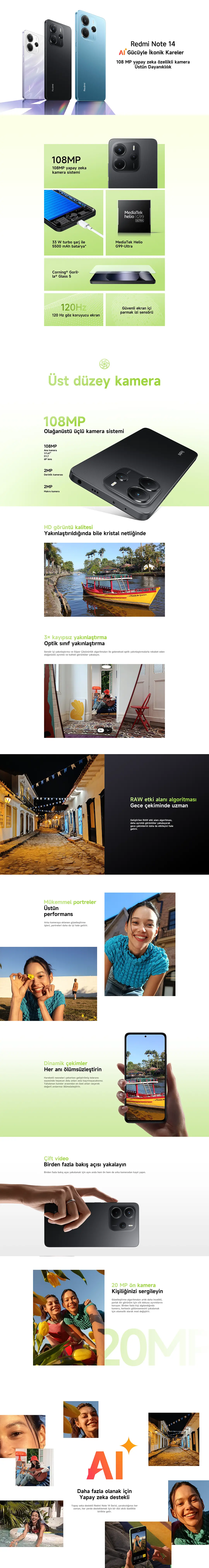 Redmi Note 14, 108 MP AI kamera sistemiyle anılarınızı net ve canlı bir şekilde yakalamanıza yardımcı olur. 33 W turbo şarj destekli 5500 mAh bataryası, gün boyu kullanım için yeterli enerjiyi sağlarken hızlı şarj imkânı sunar. MediaTek Helio G99-Ultra işlemcisiyle akıcı bir performans sunan bu model, Corning® Gorilla® Glass 5 ile dayanıklılığı bir adım öteye taşır. 120 Hz göz koruyucu ekranı sayesinde daha akıcı bir görüntü deneyimi sunarken, ekran içi parmak izi sensörü ile güvenli bir kullanım sağlar.