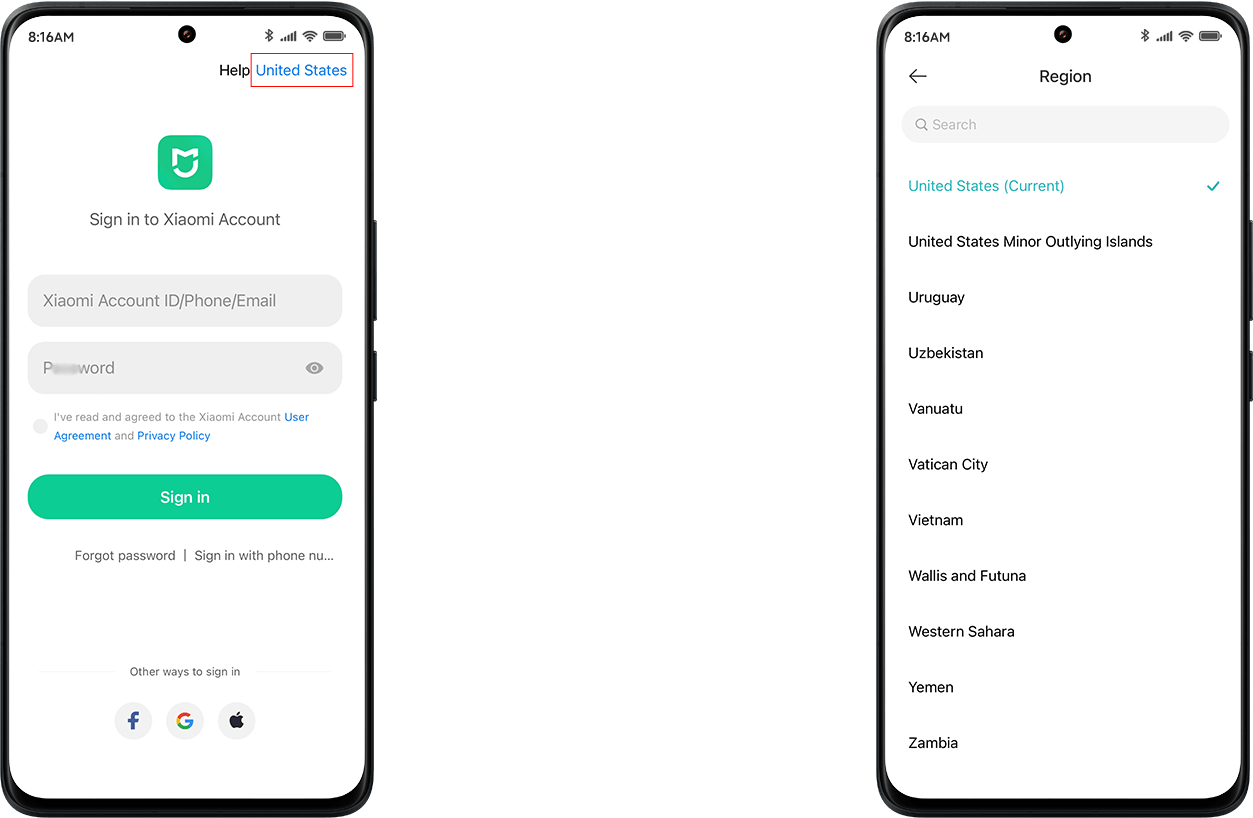 İlk oturum açma sırasında, bölgenizi değiştirmek için sağ üst köşeye dokunun.