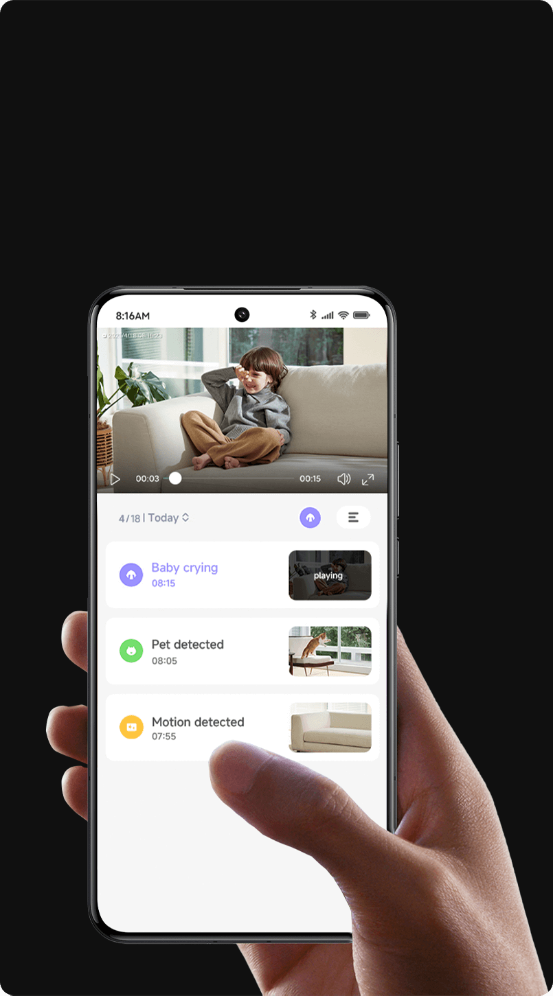Çeşitli yapay zeka özellikleriyle, kamera çocuklarınız veya evcil hayvanlarınızla ilgili olaylar algıladığında gerçek zamanlı uzaktan uyarılar gönderir. Yapay zeka işleme bulut üzerinden değil, yerel olarak yapılır, böylece daha hızlı, daha doğru yanıtlar ve gelişmiş gizlilik sağlanır.