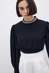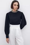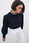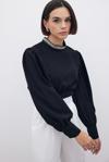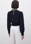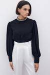 Dik yaka, manşetli balon kol, yan fermuarlı, arka yaka düğmeli kapama, bel gipe lastikli, yaka aksesuarlı kısa bluz.