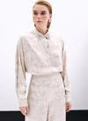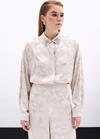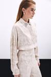 Ön gizli pat, düşük omuz, manşetli kol, yanlar mini yırtmaçlı, yaka aksesuarlı desenli salaş gömlek.