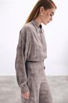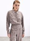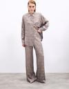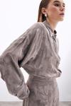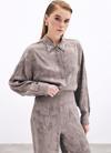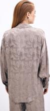 Ön gizli pat, düşük omuz, manşetli kol, yanlar mini yırtmaçlı, yaka aksesuarlı desenli salaş gömlek.