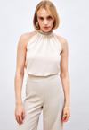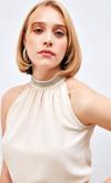 Dik yaka, arka yaka düğmeli kapama, kolsuz, aksesuar detaylı salaş bluz.