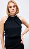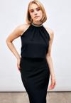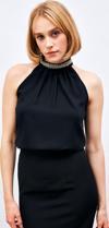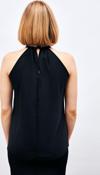 Dik yaka, arka yaka düğmeli kapama, kolsuz, aksesuar detaylı salaş bluz.