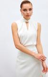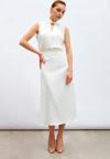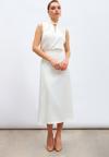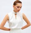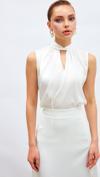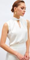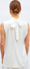 Yaka detaylı, kalça altı boy, arka yaka bağlamalı, kolsuz saten bluz.