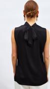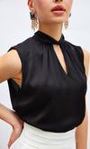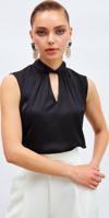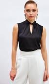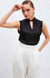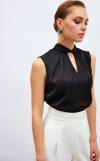 Yaka detaylı, kalça altı boy, arka yaka bağlamalı, kolsuz saten bluz.