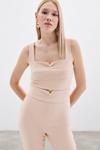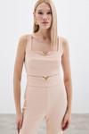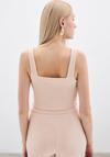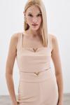 Kare yaka, kalın askılı, yan fermuarlı, yaka gold aksesuarlı kısa bluz.