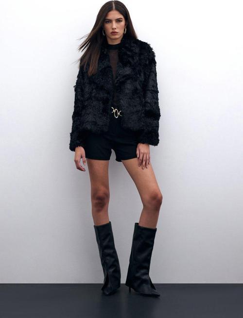 Katlı yaka, uzun kol, iç astarlı, salaş peluş ceket.
