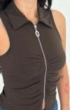Yakalı Tam Fermuarlı Kolsuz Bluz - Kahverengi