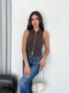Mzp Kartan Yakalı Tam Fermuarlı Kolsuz Bluz - Kahverengi