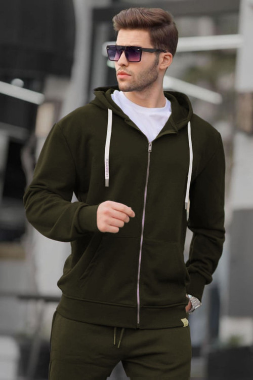 Erkek Haki Fermuarlı 3İplik Kapşonlu Oversize Hırka