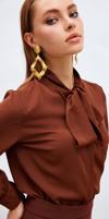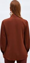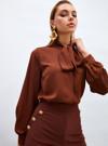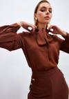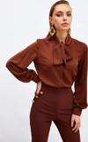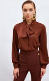 Fularlı yaka, gizli pat, düğme ilikli uzun kol, şifon gömlek.