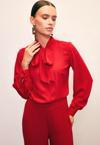 Fularlı yaka, gizli pat, düğme ilikli uzun kol, şifon gömlek.