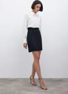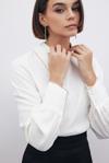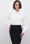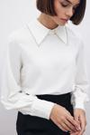 Aksesuarlı gömlek yaka, arka yaka düğmeli, manşetli ve aksesuarlı balon kol, kalça boy, parlak aksesuar detaylı bluz.
