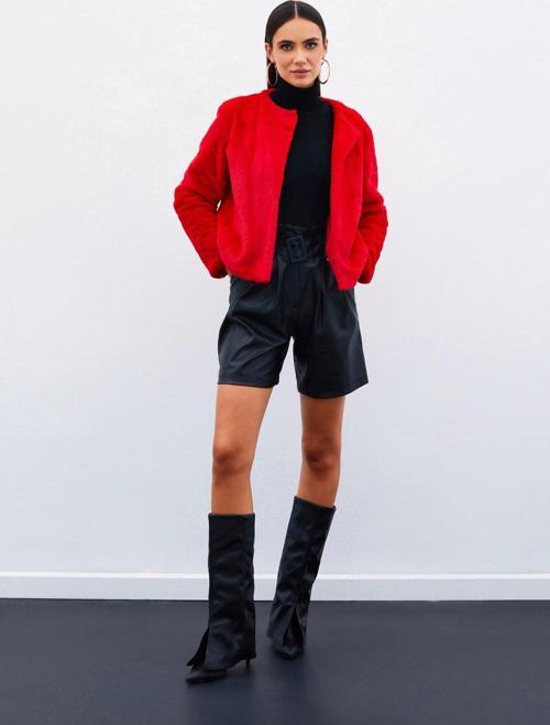 Sateen Yakasız Peluş Ceket - Kırmızı