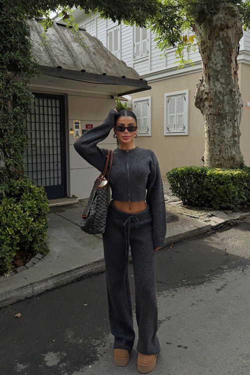 Koyu antrasit tonu ile modern bir duruş sergileyen Antrasit Zaria Triko Takım, sade detaylarla zenginleştirilmiş bir şıklık arayanlar için tasarlanmıştır. Çift fermuar detayı, pratik kullanım sağlarken özgün bir çizgi kazandırır; takımın genel silueti ise hem konforlu hem zarif bir görünüm sunar.
