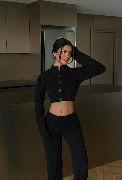 Dokulu örgü yapısı ve uyumlu formuyla öne çıkan crop üst ve pantolon takımı, modern ve dengeli bir siluet sunar. Düğme detaylı üst parça tasarıma şık bir vurgu katarken, esnek ve yumuşak dokusu sayesinde gün boyu konfor sunar.