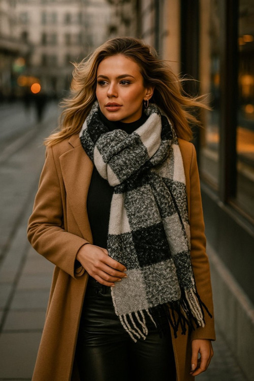 - Gri, siyah ve beyaz tonlarındaki kareli desen ve püskül detaylarıyla eşsiz bir görünüm sunar.