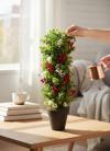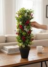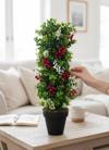Kırmızı kokina meyveleri, ağaca yılbaşı ruhunu ve sıcak bir dokunuş kazandırırken, siyah saksısı ürüne modern ve şık bir kontrast oluşturur. Bu sayede hem klasik hem de çağdaş dekorasyon tarzlarıyla mükemmel uyum sağlar.