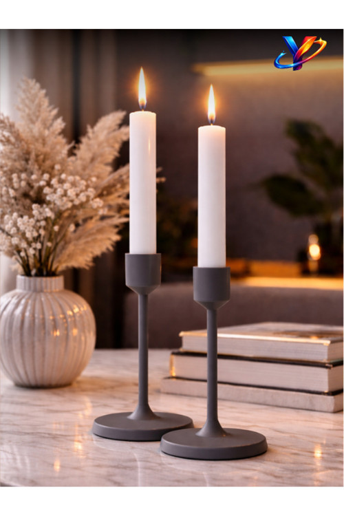 Modern tasarımıyla evinizin dekorasyonuna şıklık katan ikili ayaklı şamdan mumluk.