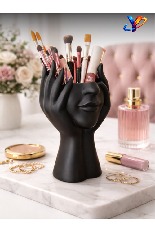 Makyaj masanıza hem şıklık hem de düzen kazandıran bu özel tasarımlı makyaj fırçası düzenleyici, estetik görünümü ve fonksiyonel yapısıyla dikkat çeker. Ellerin yüzü kavradığı sanatsal formu sayesinde dekoratif bir obje olarak da kullanılabilir.