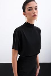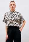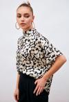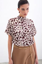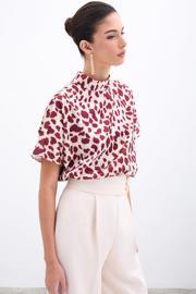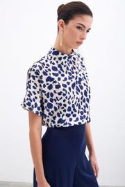 Dik yaka, yarım kol, arka yaka düğmeli, desenli salaş bluz.