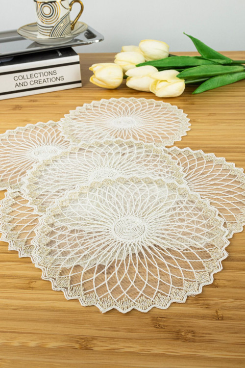 - Krem rengi ve altın sim detaylarıyla zenginleştirilmiş bu bardak altlıkları, sofralarınıza şıklık katar.