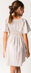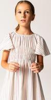 Yarım bol kalıp kol kesimi ve beli kendinden lastikli tasarımıyla dikkat çeken bu elbise, beyaz üzerine ince renkli çizgili kumaşıyla yazın en çok giyilen elbisesi.
