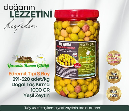 Köy usulü taş kırma yöntemiyle özenle işlenmiş, doğal tat ve gevreklik sunan Edremit tipi yeşil zeytinler. Büyük L boy, 291–320 adet/kg, net 1 kg’lık ambalajıyla sofranıza sağlık ve lezzeti taşıyor. Katkısız, doğal ve geleneksel yöntemlerle hazırlanmış bu zeytinler kahvaltılarınızı ve mezelerinizi daha da zenginleştirecek.