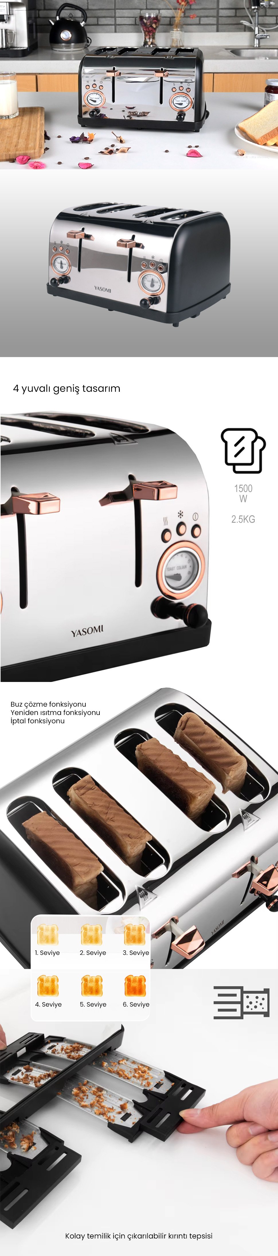 Kahvaltılarınızı keyifli hale getiren Yasomi YK-628T 4 Dilimli Geniş Yuvalı Ekmek Kkızartma Makinesi, aynı anda 4 dilim ekmek kızartabilme özelliğiyle aile boyu kullanım için idealdir.