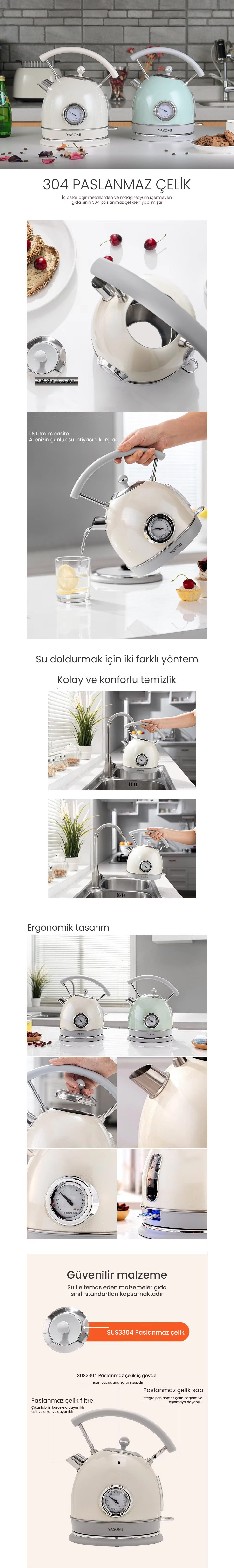 1850–2200W ani ısıtma gücü sayesinde suyunuzu dakikalar içinde kaynatır. 1.8 litre geniş kapasitesi, hem günlük kullanım hem de kalabalık aileler için idealdir. Paslanmaz çelik gövdesi uzun ömürlü kullanım sunarken, retro detayları ile mutfağınıza zarif bir dokunuş katar.