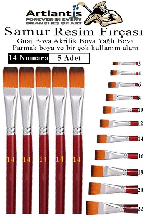 Artlantis Yassı Uçlu 14 Numara Resim Fırçası 5 li 1 Paket Samur Kesik Uçlu Fırça Seti Guaj Sulu Akrilik Yağlı Boya Fırçaları