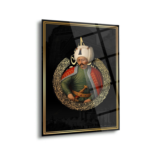 Osmanlı Devleti’nin en güçlü ve kararlı hükümdarlarından biri olan Yavuz Sultan Selim’i sanatsal bir kompozisyonla yansıtan bu özel cam tablo, tarihî ihtişamı modern dekorasyon anlayışıyla bir araya getirir. Padişah portresi etrafında yer alan zarif hat sanatı detayları ve Osmanlı motifleri, tasarıma hem estetik hem de kültürel bir derinlik kazandırır.
