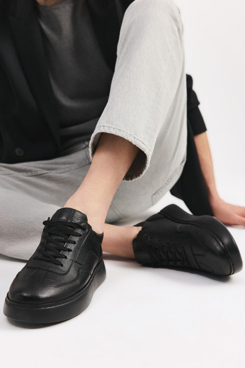 Erkek Deri Siyah Hafif Tabanlı Spor Ayakkabı