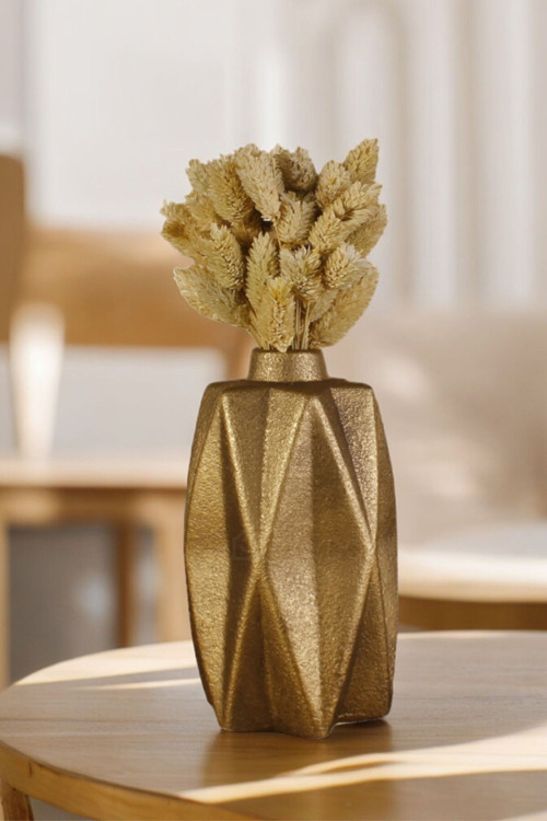 - Tek parça halinde sunulan bu dekoratif vazo, minimalist ve şık bir görünüm arayanlar için idealdir; - Alçı materyali sayesinde dayanıklı ve uzun ömürlü kullanım sunar; - Eskitme altın rengi ile modern ve vintage dekorasyon tarzlarına kolayca uyum sağlar;