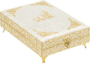 Furkan Yayınevi İnci Serisi Ahşap Kadife Kaplamalı Plaket Kutu + Çanta Boy Arapça Kadife Kuran + Cam İnci Tesbih + Namaz Başörtüsü + Pleksi Ayraç Hediye Seti Gold (90308) - Furkan Yayınevi